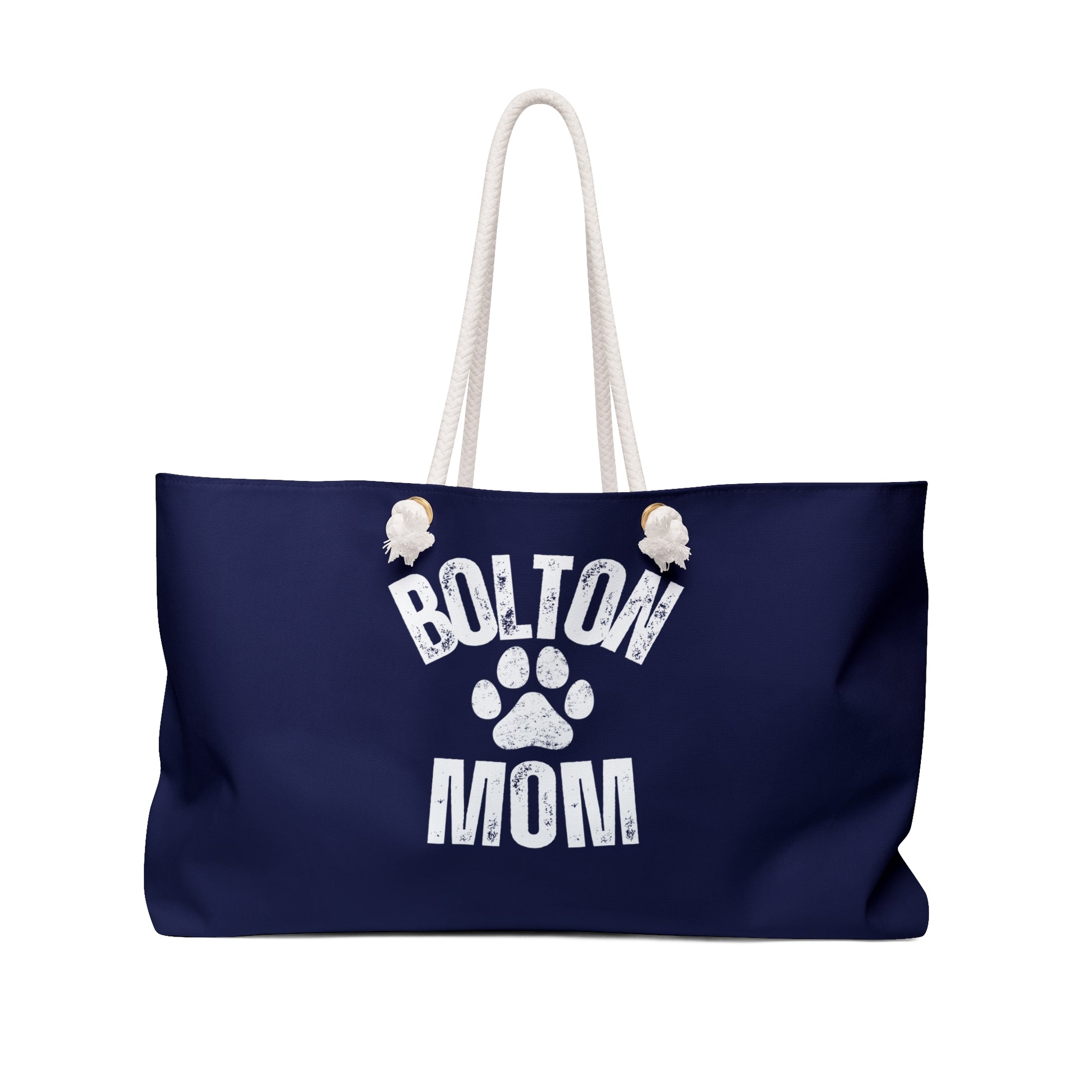 This oversized Weekender Tote features our distressed Bolton Mom graphic on both sides. It's a perfect size for your weekend at the beach or in town. The wide-mouthed, durable bag holds a generous amount of personal items and is easily held by its thick rope handles.