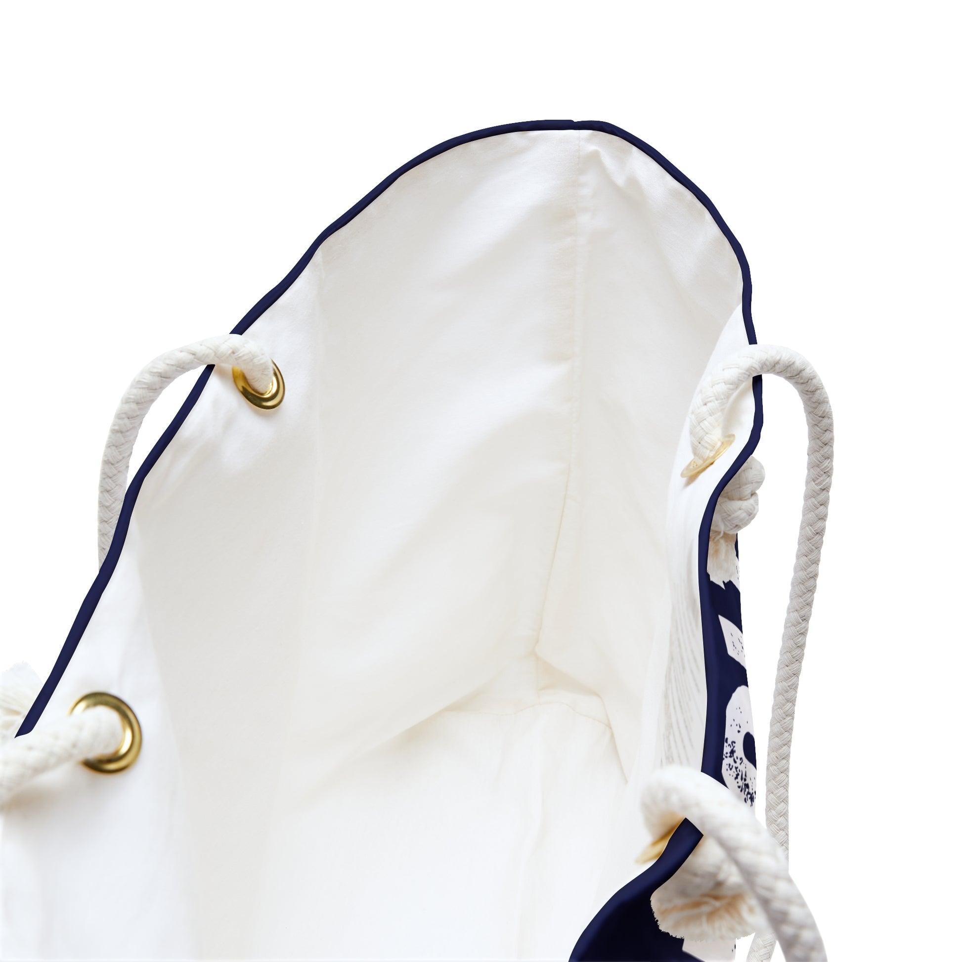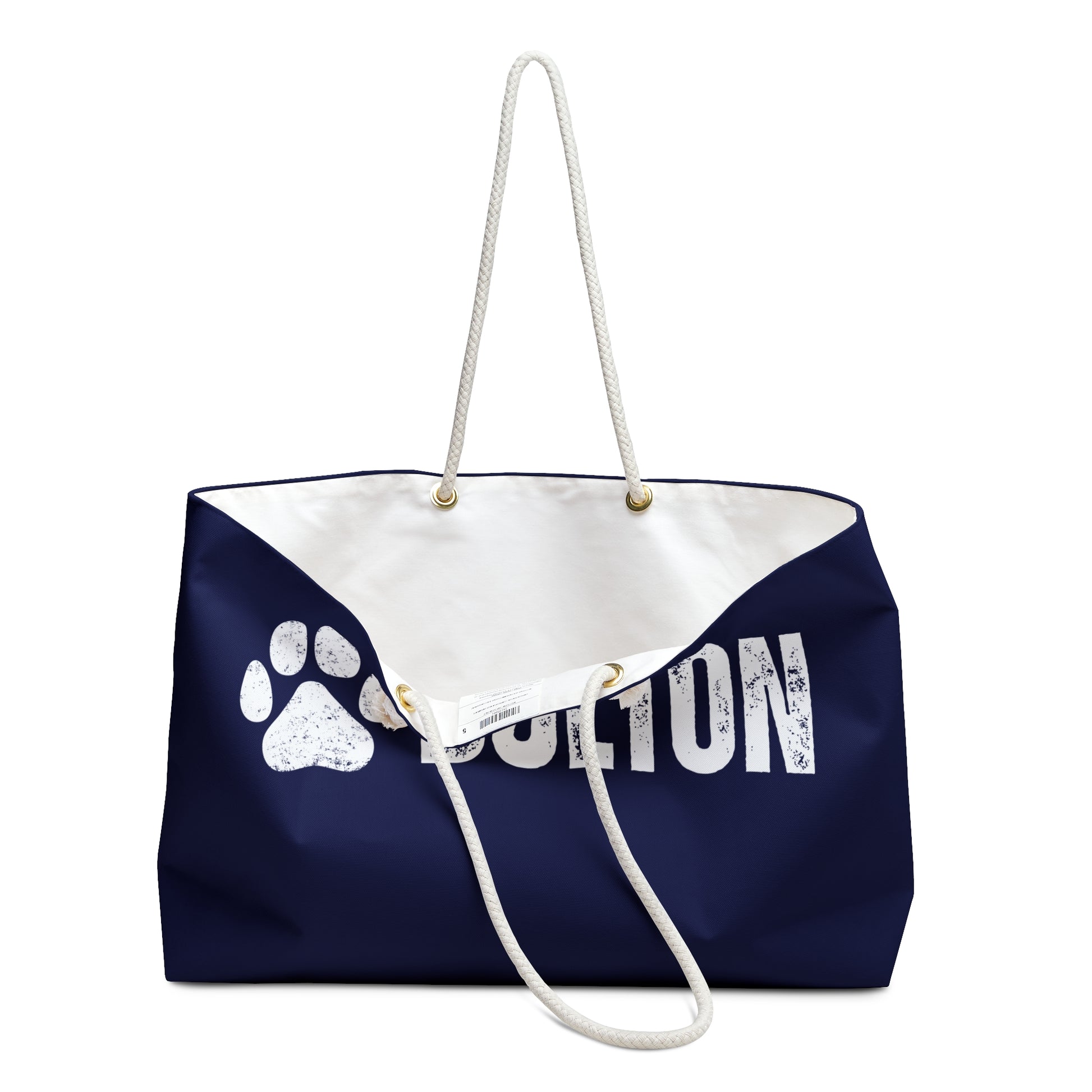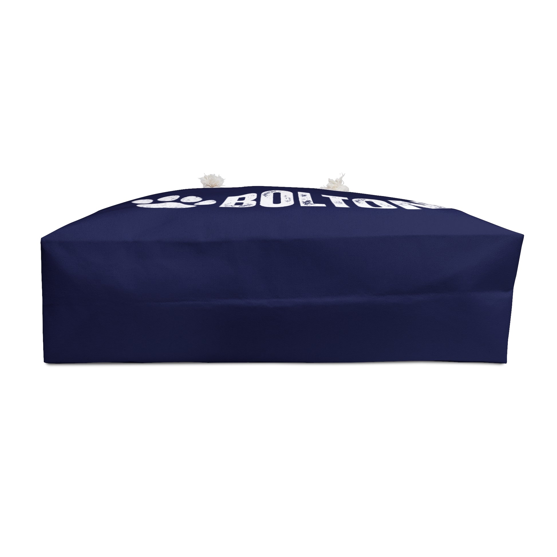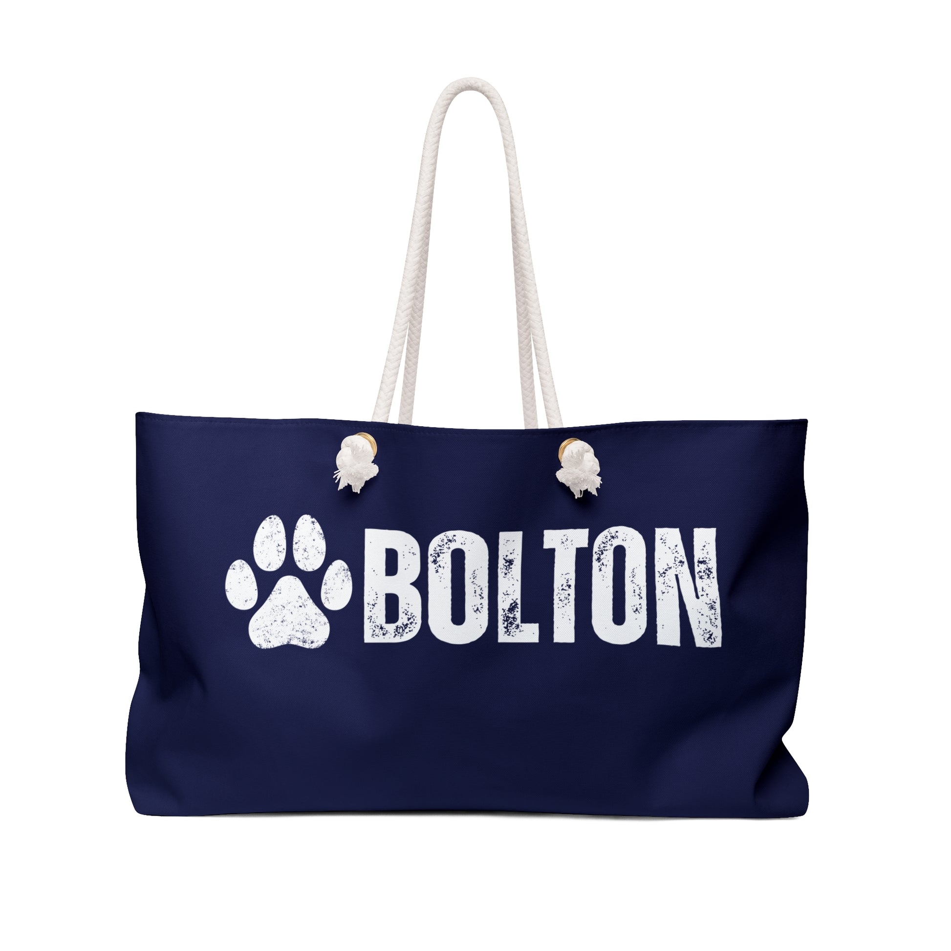 This Weekender Tote features our distressed Bolton paw print graphic on both sides of the bag. It is a perfect size for your weekend at the beach or in town. The wide-mouthed, durable bag holds a generous amount of personal items and is easily held by its thick rope handles.
